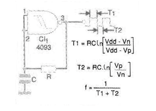 En el caso, aprovechamos sólo una de las cuatro puertas NAND del 4093, pudiendo las otras tres puertas ser usadas con otras finalidades. El circuito básico, con la fórmula que permite calcular su frecuencia se da en la figura 16.