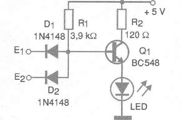 El circuito presentado en la figura 1 es un puerto lógico NOR (no-OU) en el que un LED se enciende cuando una u otra entrada está en el nivel bajo.