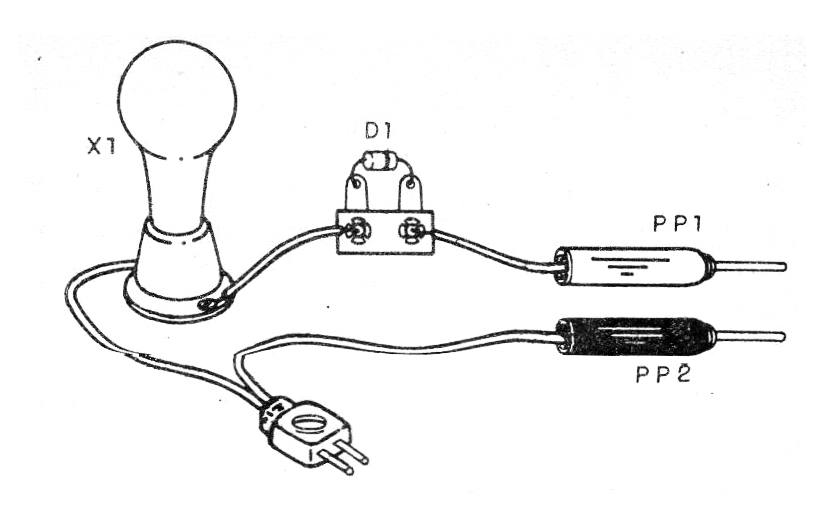 El circuito utiliza como indicador una lámpara incandescente de 5 a 15 W y tiene un diodo que posibilita la realización de las pruebas con corriente continua pulsante, lo que es interesante en diversos casos, como la prueba de diodos.