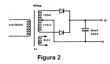 Ver que los 6 V son llevados directamente al filamento de la válvula mientras que la alta tensión debe antes pasar por un proceso de rectificación y filtraje. a través de dos, diodos y un capacitor antes de ser llevada a la válvula.