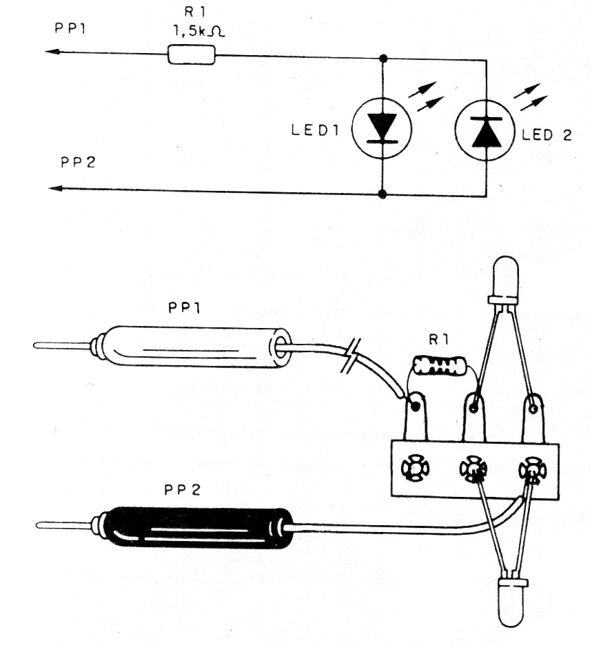 En la figura 1 tenemos el diagrama y el montaje del indicador de polaridad en un pequeño puente de terminales. Para mayor facilidad de identificación sugerimos usar LED de colores diferentes.