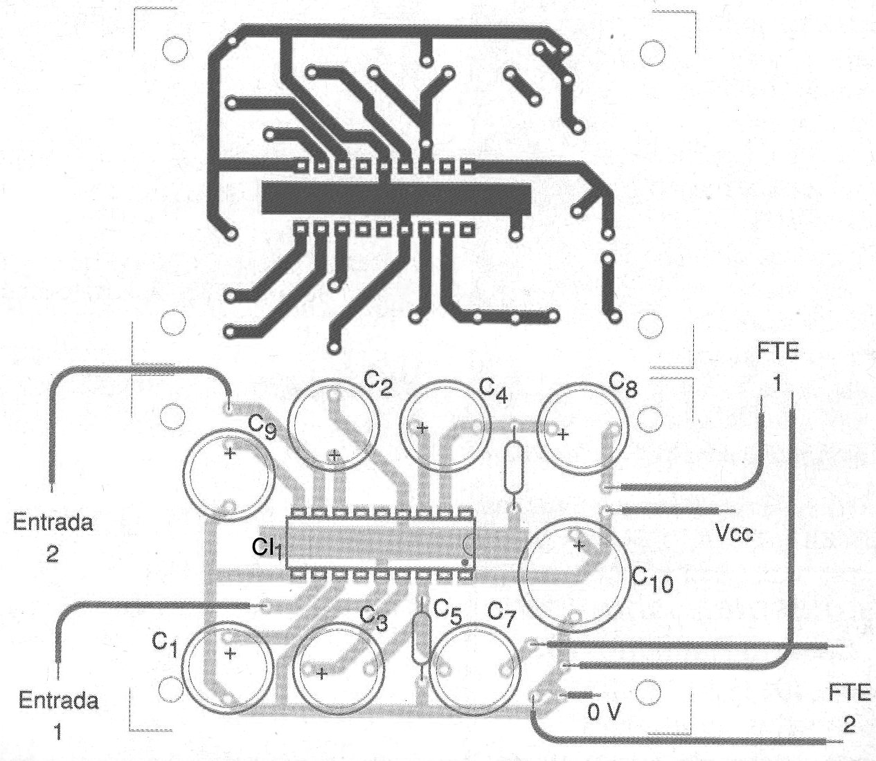 En la figura 2 tenemos la placa de circuito impreso para el montaje, observándose la gran área cubierta que se deja de propósito para funcionar como disipador de calor y como tierra blindada el circuito.
