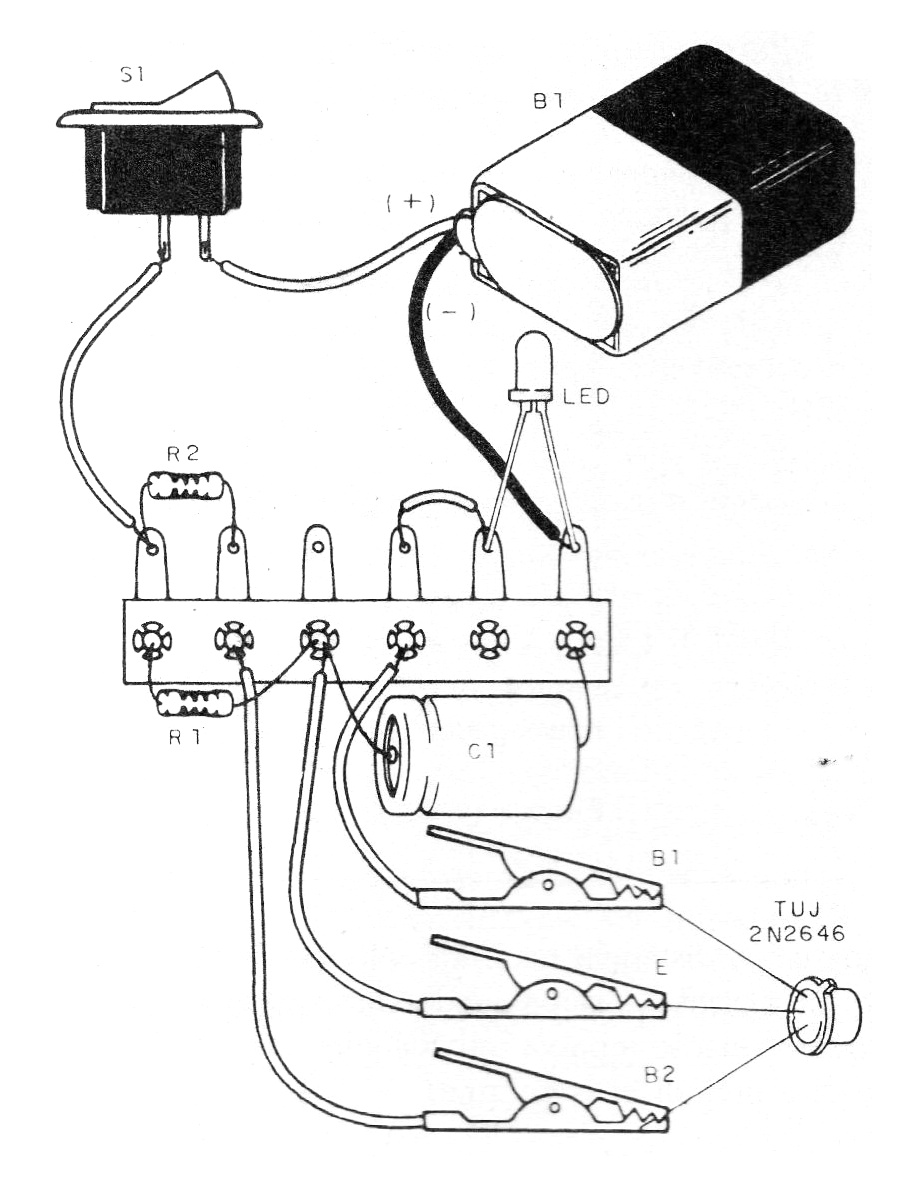 Con este circuito es posible probar transistores unijuntura (TUJ o UJT) como, por ejemplo, los más conocidos 2N2646. Si el transistor está en buen estado, el LED parpadeará. El circuito es alimentado por una batería de 9 V y su consumo es muy bajo.