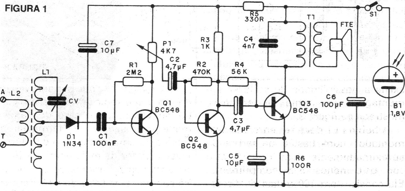 Este circuito, aunque simple, capta las estaciones más fuertes incluso sin antena y proporciona una escucha a nivel razonable en un pequeño altavoz y, mejor aún, en un auricular de baja impedancia.