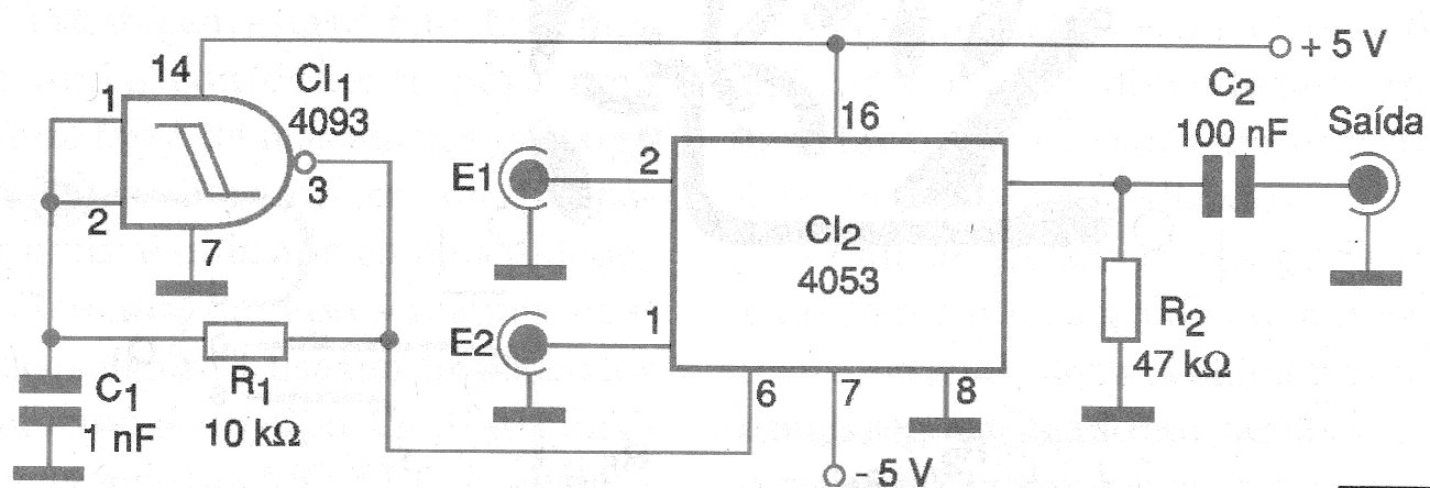 Este simple diseño es de un mezclador digital con el circuito integrado CMOS 4053. La conmutación de las entradas es hecha por un circuito oscilador cuya frecuencia está por encima del límite audible.