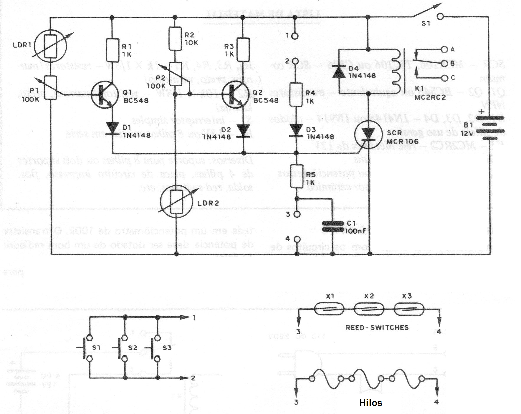 Este circuito reúne en un sistema único diversos tipos de alarmas. Así, los sensores por presión, los sensores por interrupción o reed - switches, los sensores de luz actuando de dos modos diferentes: por la interrupción de la luz y por la incidencia de la luz.
