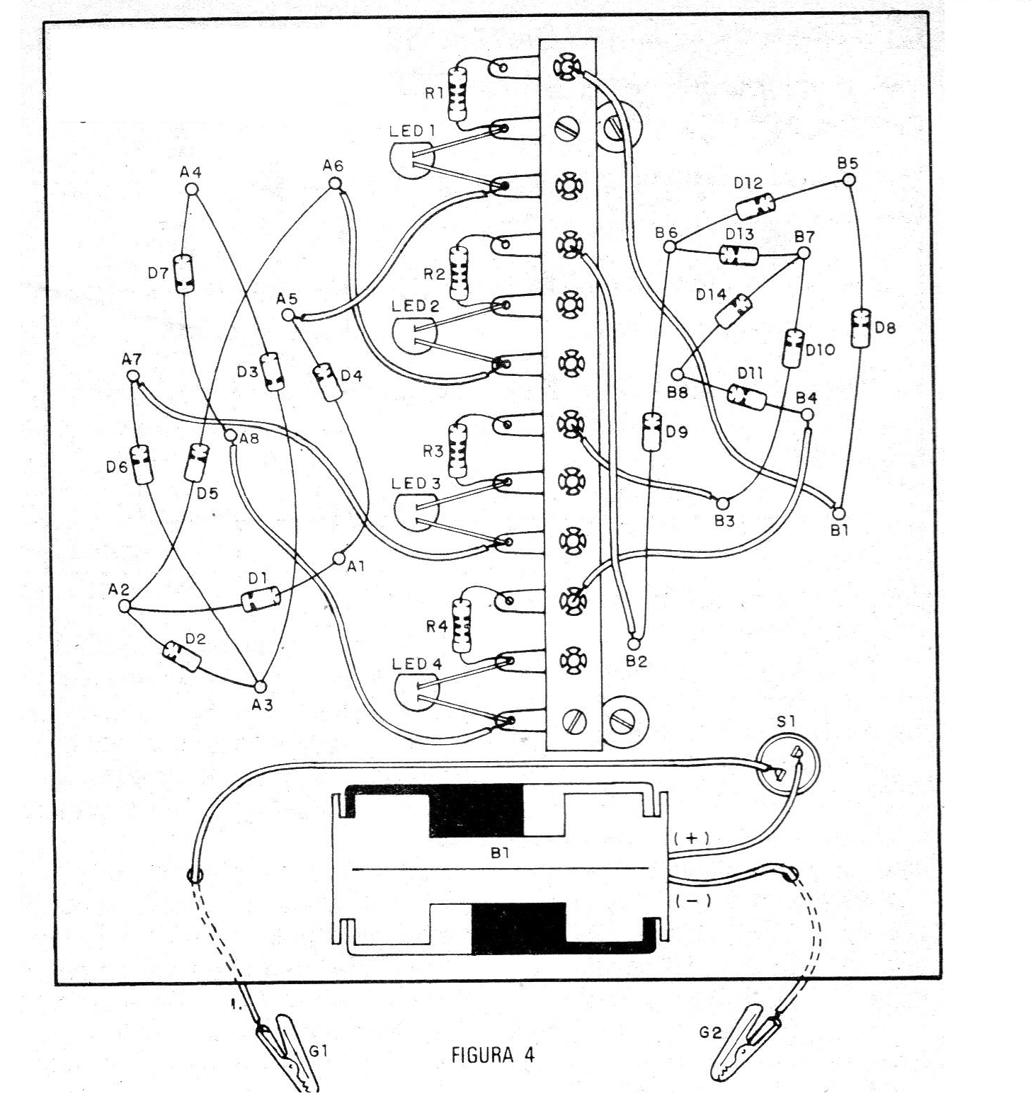 En la figura 4 damos la disposición de las conexiones en el tablero visto por debajo, con los LED y resistores soldados en un puente de terminales.