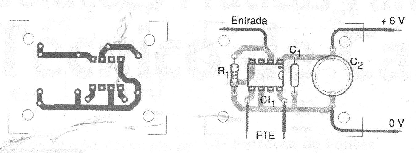 Se basa en el circuito TDA 7051 que proporciona cerca de 1 W con alimentación de 6 V y sólo necesita una resistencia y dos capacitores externos. Para el acoplamiento al circuito externo es interesante utilizar un capacitor de 100 nF a 10 uF dependiendo de la fuente de señal.