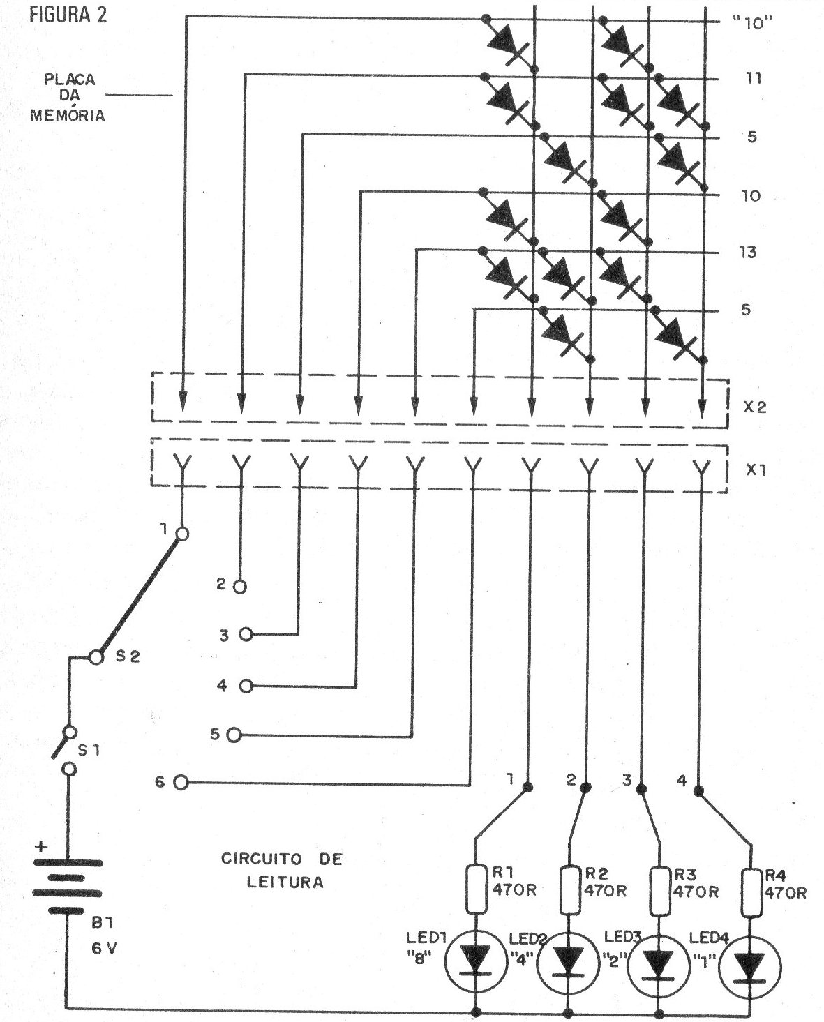 Después de programar una placa con diodos, encaje en un sistema de lectura. Conectando S1 y accionando en secuencia S2, usted debe tener los números en binario presentados por los LED.