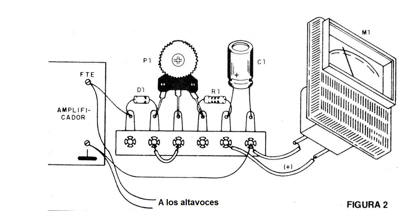 En la figura 2 tenemos el montaje en un puente de terminales y su conexión en el aparato de sonido. Observe que basta con soldar los cables del VU-meter en los hilos del altavoz.