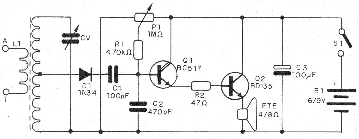 Esta pequeña radio para la banda AM utiliza dos transistores en la configuración de Darlington, con suficiente potencia para alimentar un pequeño altavoz. La radio es alimentada por 2 o 4 pilas y tiene buena sensibilidad.