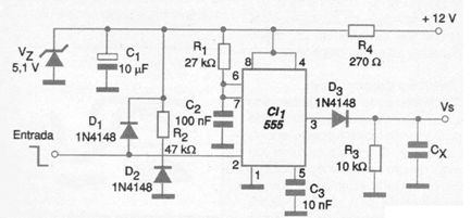 Se trata de un multivibrador monoestable cuya distancia entre los pulsos de salida disminuye cuando la frecuencia de los relojes aumenta. La señal de salida está integrada por Cx cuyo valor debe obtenerse experimentalmente en el rango de 1 nF a 1 uF dependiendo del rango de frecuencias que debe medirse. Cada pulso de disparo se obtiene llevando la entrada del circuito momentáneamente al nivel bajo.
