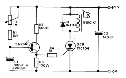 Con un capacitor de 2 200 uF y un potenciómetro de 1 Mega ohm podemos obtener tiempos superiores a 1 hora. La alimentación se realiza con 9 Volts, ya que el SCR tiene una caída de 2V, por lo que el relé será de 6V. El circuito completo de esta importante aplicación del transistor uniuntura se muestra en la Figura abajo.