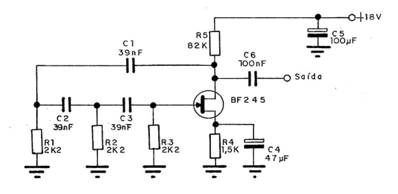 Este circuito es un oscilador de audio de desplazamiento de fase y puede generar señales alrededor de 1 KHz, según la tolerancia de los componentes utilizados. Podemos usarlo como inyector de señal o como base para un instrumento de prueba de amplificadores de audio, ya que la salida tendrá una amplitud de alrededor de 6V cuando alimentamos el circuito con tensiones de 15 a 18 V.