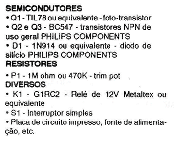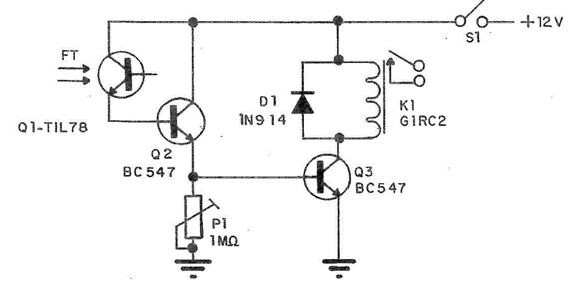 Se utilizan dos transistores y la sensibilidad se controla en el trimpot de 470K. El relé utilizado es de 12V para 50 mA (G1RC2, por ejemplo) y la carga máxima controlada es de 10 amperes. La alimentación se puede suministrar con baterías si el relé se energiza por períodos cortos de tiempo. Si es constante y prolongado, se debe utilizar la fuente de alimentación.