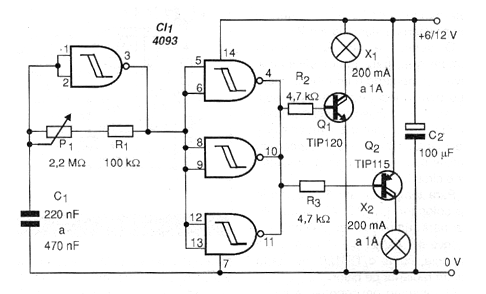 El circuito de la figura 1 hace que dos lámparas parpadeen alternativamente a una frecuencia que se puede ajustar en P1.