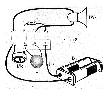 Tanto la polaridad de las pilas como del micrófono de electreto deben ser observadas. El resistor R1 es de 1/8 W o mayor y en realidad su valor debe ser obtenido experimentalmente en función de la tensión de alimentación, quedando típicamente entre 1k y 10 k ohms.