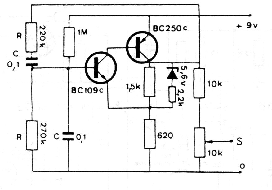 Este circuito fue encontrado en una documentación antigua, pero puede ser elaborado con transistores equivalentes como los BC548 y BC549. La frecuencia depende de R y C y para los valores indicados es de 6,5 Hz. La salida puede ser ajustada para permitir la operación como shield usando entradas analógicas de microcontroladores.