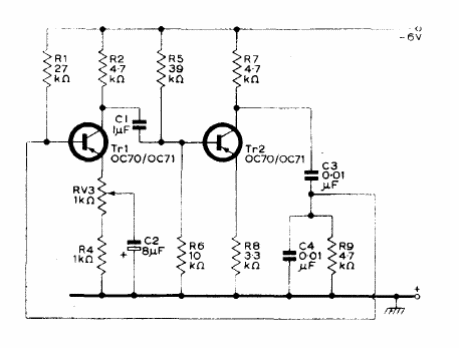 La frecuencia de este oscilador, que se encuentra en el manual de referencia de transistores de 1960, está alrededor de 3,5 kHz. El circuito genera una señal senoidal cuya linealidad puede ajustarse en RV3.