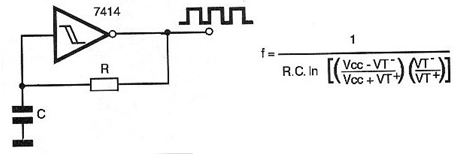 El circuito mostrado en la figura tiene básicamente la misma configuración del anterior con la diferencia de que hace uso de un variador TTL que permite alcanzar algunas decenas de megahertz utilizando dispositivos de la subfamilia LS. La fórmula que relaciona los valores de los diversos componentes del circuito con la frecuencia se da junto al diagrama. Las tensiones T + y T son las de los puntos de disparo en la subida y bajada de la tensión, ya que se trata de un dispositivo disparador. El circuito integrado utilizado puede ser el 7414 y la alimentación debe realizarse con 5 volts.