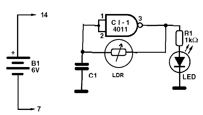 La frecuencia de los intermitentes del LED depende de la cantidad de luz que incide en el LDR. Con más luz el LED parpadea más rápido. El capacitor puede tener valores entre 100 nF y 10 uF, dependiendo de la cantidad de luz que se desea usar en el control. Para mayor sensibilidad el LDR debe montarse en un tubo. La alimentación debe realizarse con una fuente de 5 V a 12 V. El circuito integrado 4001 también se puede utilizar en esta aplicación.