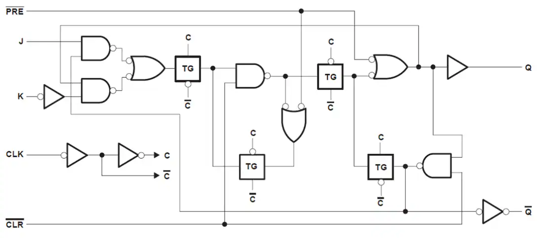 Los flip-flops J-K duales SN74HC112 de Texas Instruments contienen dos flip-flops J-K independientes activados por flanco negativo. Un nivel bajo en las entradas claras (/CLR) o preestablecidas (/PRE) restablece o desarma las salidas, independientemente de los niveles de las otras entradas. Los datos en las entradas J y K que cumplen con los requisitos de tiempo de configuración se transfieren a las salidas en el borde negativo del pulso de reloj (CLK) cuando /CLR y /PRE están inactivos (altos). La activación del reloj no está directamente relacionada con el tiempo de caída del pulso CLK y se produce a nivel de voltaje. Los datos de entrada J y K se pueden cambiar sin afectar los niveles en las salidas después del intervalo de tiempo de espera. Los flip-flops SN74HC112 de Texas Instruments son flip-flops versátiles que funcionan como flip-flops de palanca conectando J y K en alto.