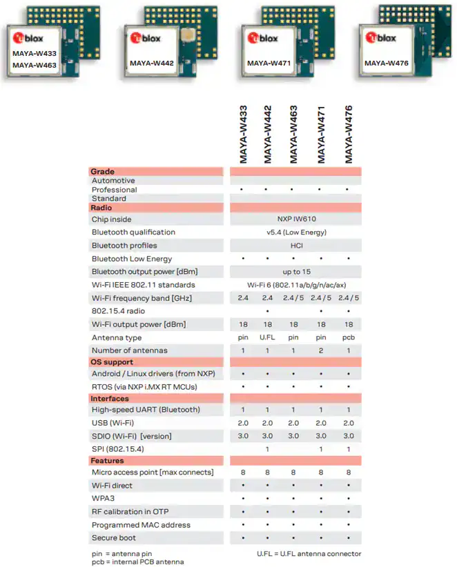 Los módulos Tri-Radio u-blox MAYA-W4 son módulos de conectividad inalámbrica rentables compatibles con Wi-Fi 6 de doble banda, BLUETOOTH® Low Energy 5.4 y 802.15.4. Los módulos MAYA-W4 brindan conectividad confiable y segura para aplicaciones que incluyen redes de malla de bajo consumo para hogares inteligentes y conectividad Wi-Fi 6 de alta velocidad para herramientas industriales. Estos módulos tri-radio resuelven problemas de congestión de la red, aumentan la eficiencia energética y ofrecen un rango de temperatura industrial de -40 °C a +85 °C. Manteniendo las mismas dimensiones compactas que sus predecesores (10 mm x 14 mm x 1,9 mm), estos módulos simplifican la migración entre generaciones anteriores. Las aplicaciones típicas incluyen Internet de las cosas (IoT) y redes en malla, industriales, médicas y de consumo.