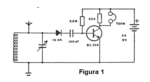 Esta posibilidad nos lleva al tipo más simple de radio transistorizado, o sea, la radio con un solo transistor usado como amplificador. El circuito completo de esta radio con los valores de los componentes se muestra en la figura 1.