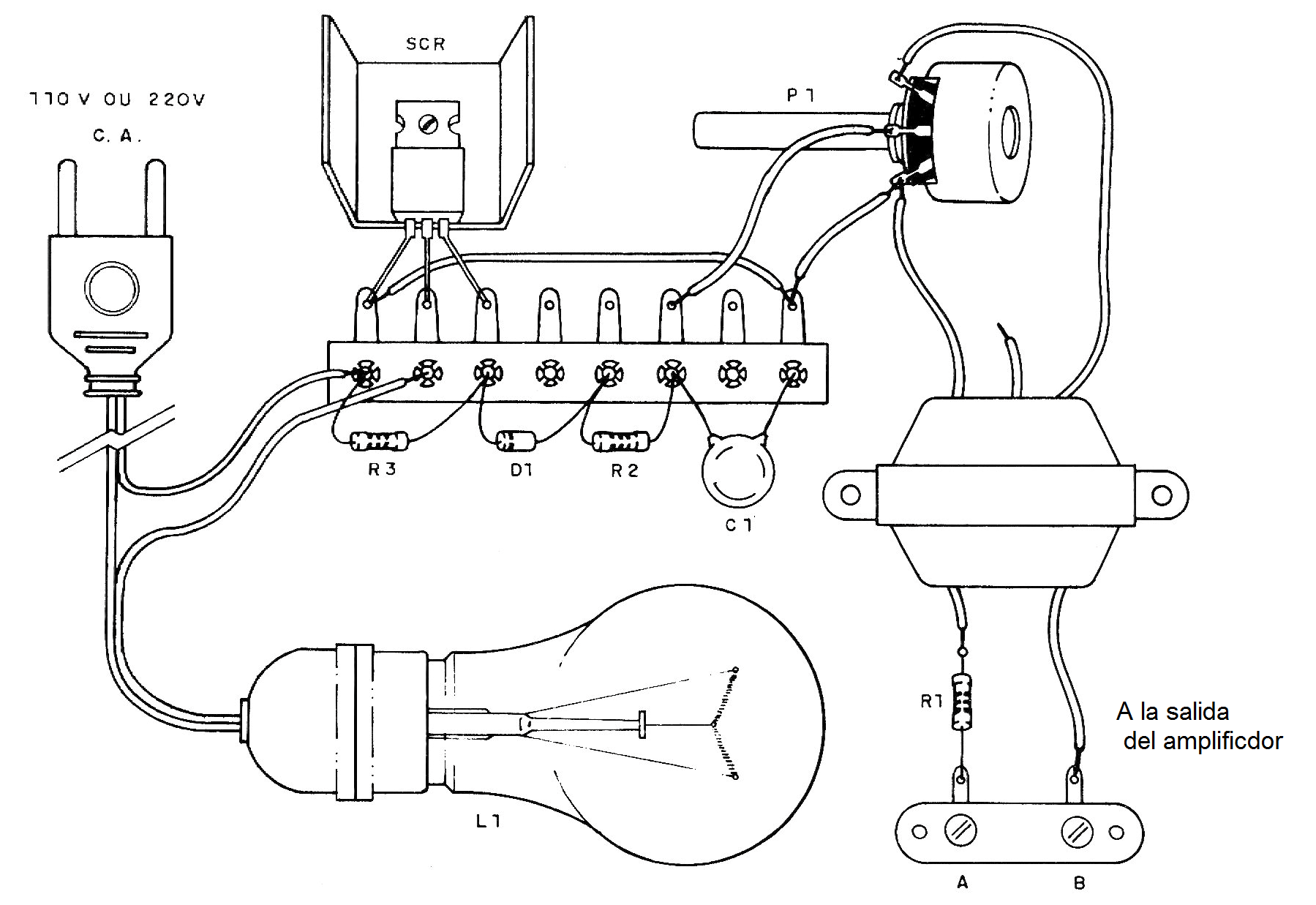 Este circuito simple da un efecto de luz interesante para su equipo de sonido. En la salida al altavoz de cualquier aparato de sonido, hace que una lámpara incandescente parpadee en el ritmo de la música.