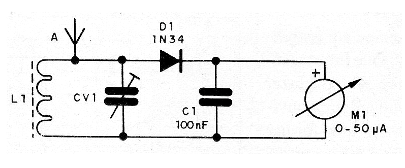 Este circuito simple, que no necesita fuente de alimentación, mide la intensidad del campo producido por transmisores de ondas medias y cortas.