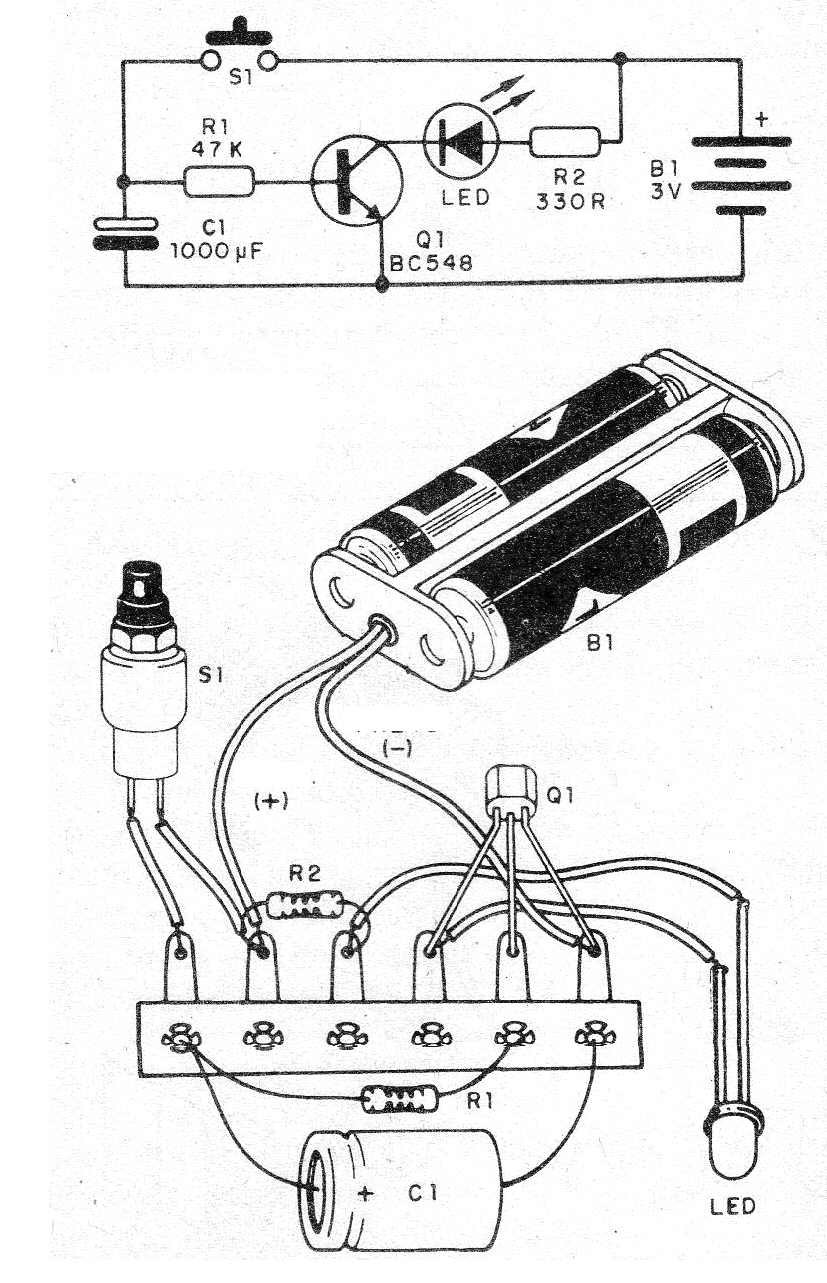 El transistor puede ser de cualquier tipo de uso general NPN y el LED también puede ser de cualquier color o tipo. El tiempo depende de C1 que puede tener valores entre 100 uFe 4 700 uF. El resistor puede tener valores entre 10k y 100 k. Los tiempos de más de 1 minuto se pueden obtener con 4 700 uF y 100k.