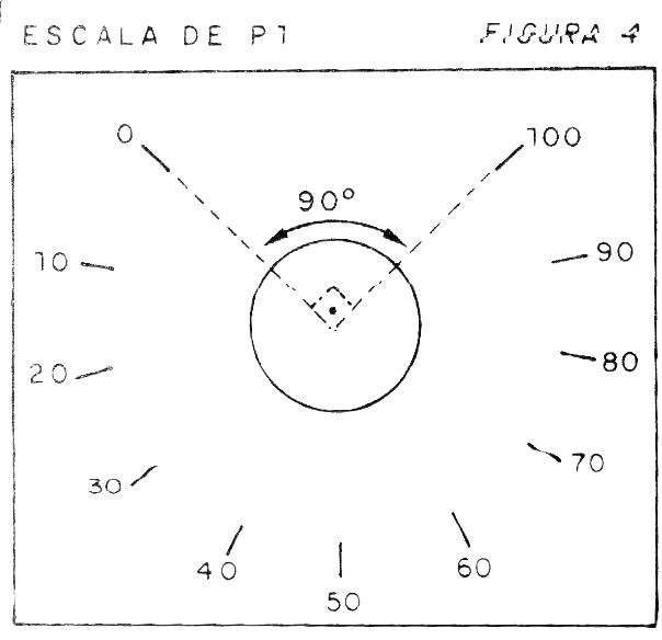Divisa la escala del potenciómetro en partes iguales que corresponden a 1/10 del valor de su resistencia. Suponiendo la utilización de un potenciómetro de 100k tendremos divisiones de 10k, como muestra la figura 4.