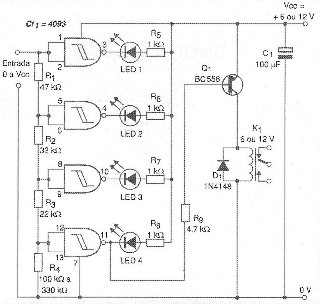 Las tensiones de accionamiento de cada uno de los 4 LEDs son programadas por el divisor resistivo formado en las entradas de las puertas NAND del 4093 que funcionan como comparadores.