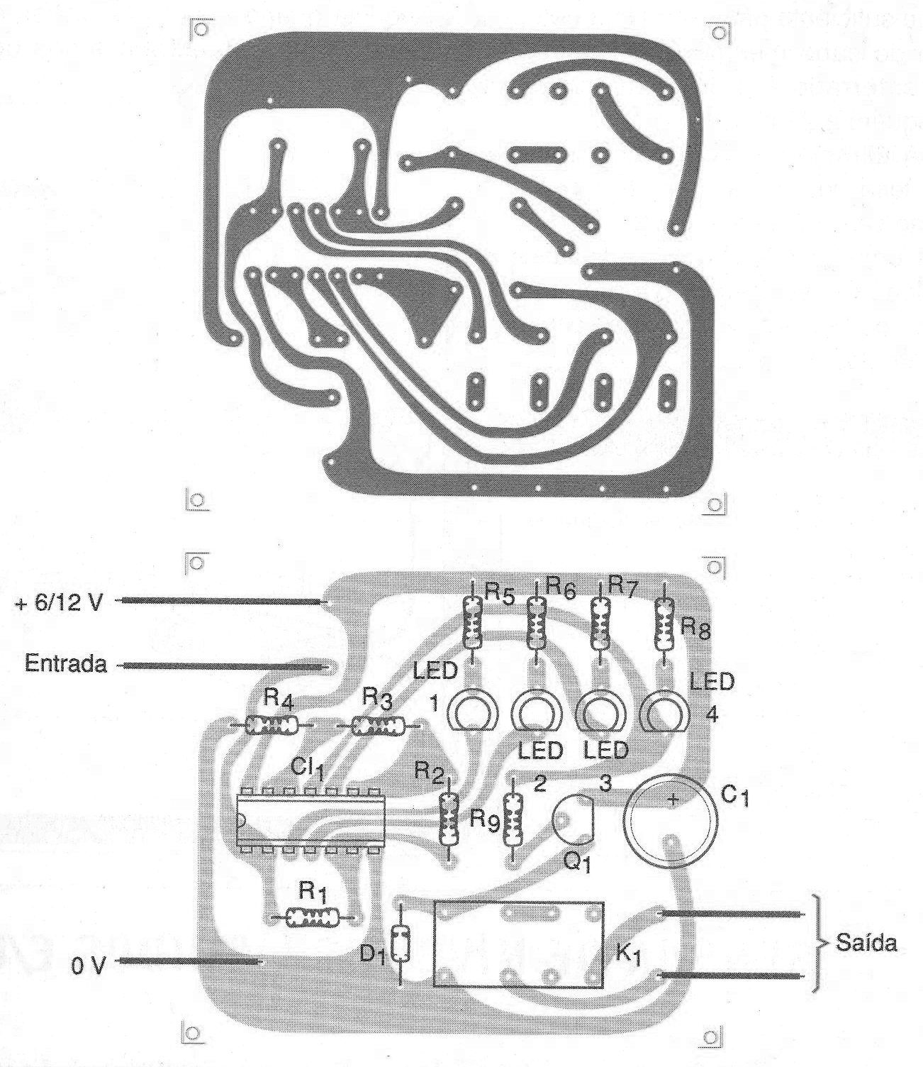 En la figura 2 tenemos la placa de circuito impreso para esta aplicación suponiendo el uso de LEDs discretos y de un relé con base DIL para montaje en zócalo.