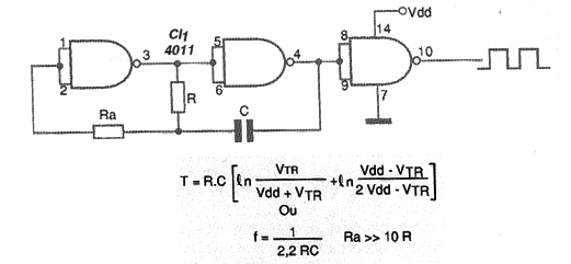Este oscilador RC tiene su frecuencia calculada de modo exacto por la primera fórmula donde Vtr es la tensión de disparo de cada puerta.