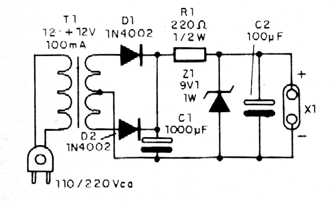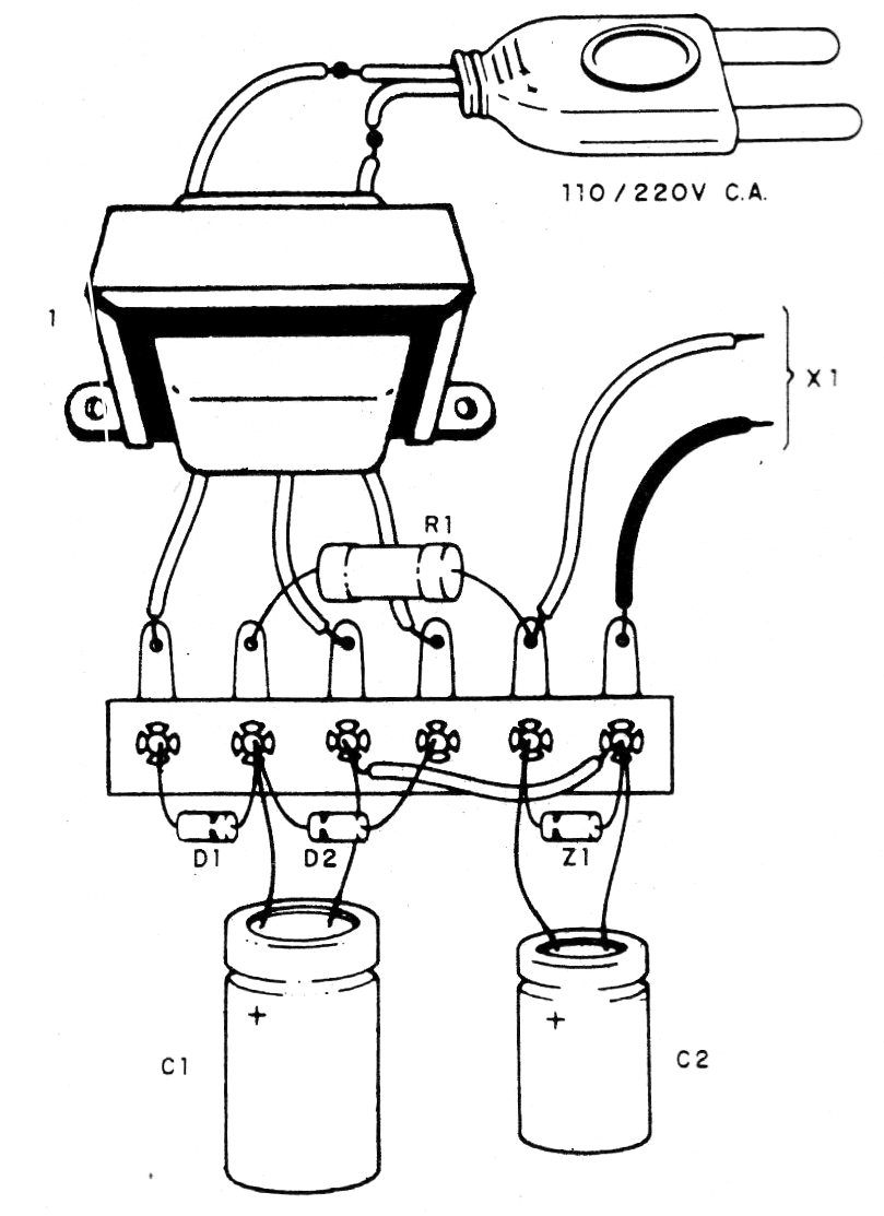 El circuito utiliza un transformador de 9 + 9 V de secundario con corriente entre 50 y 200 mA. El diodo zener es de 1 W y en la salida debemos utilizar un conector o enchufe de acuerdo con el aparato que va a ser alimentado. En la figura 1 tenemos el circuito completo del eliminador.