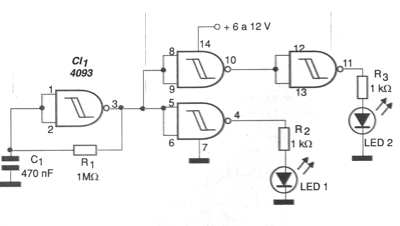 El oscilador mostrado en la figura 1 puede accionar tanto dos LEDs separados como un LED bicolor en una frecuencia que depende tanto de R1 y R2.