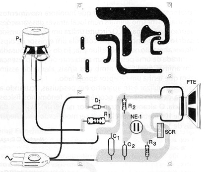 La tensión de la red de energía es rectificada, sirviendo para cargar lentamente, a través de R1 y P1, el capacitor C1. La carga de este capacitor determina la energía o potencia del pulso sonoro que se va a producir.