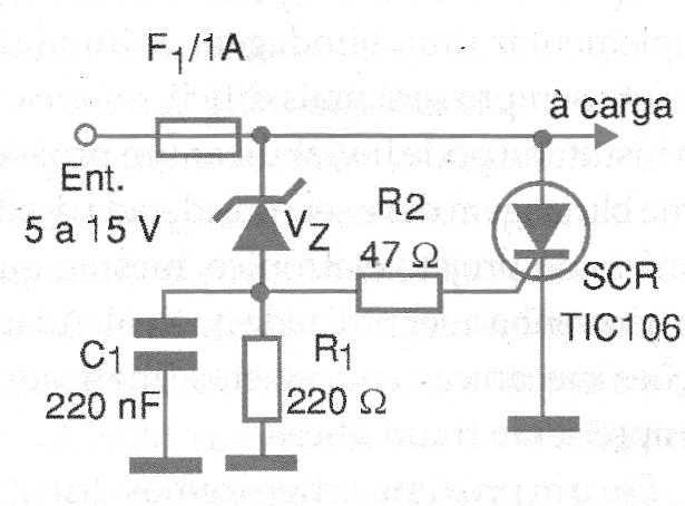 El circuito mostrado en la figura 1 es una protección del tipo "Crow Bar" en la que el disparo ultra rápido de un SCR cuando la tensión de referencia Vz es superada causa la apertura del fusible. Esta acción rápida de interrupción del circuito puede ser importante en los casos en que tenemos un aumento lento de la corriente en caso de problemas, lo que puede llevar a los componentes más frágiles la quema. Vz es un zener de 400 mW o más y el SCR TIC106 no necesita radiador de calor ya que el tiempo de conducción de este componente es muy pequeño.