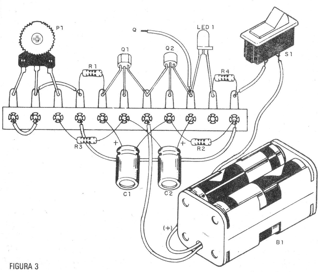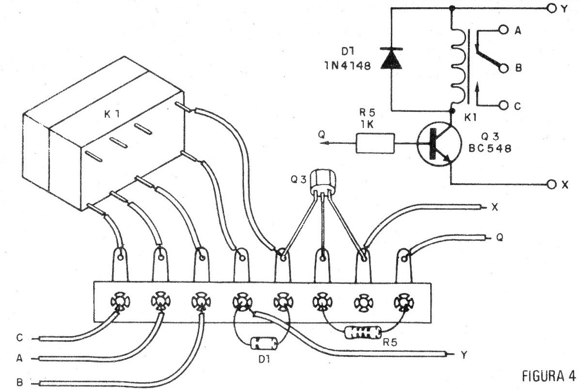 El montaje de este circuito en un puente de terminales se da en la misma figura, pero nada impide que su realización sea en placa de circuito impreso.