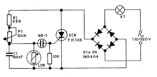 Nuestra aplicación para un SCR en una red de 110 V o 220 V CA es un circuito que enciende automáticamente una bombilla cuando oscurece y la apaga al amanecer. El sensor es un LDR común que debe apuntar hacia el cielo, para recibir solo la luz ambiental y no la luz de la lámpara que controla, ya que esta traería una retroalimentación capaz de causar oscilaciones. El ajuste del punto de disparo se realiza en el potenciómetro. En la figura tenemos el esquema de este interruptor. El SCR tendrá un radiador de calor.