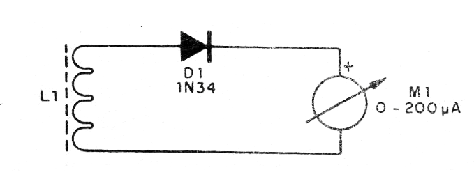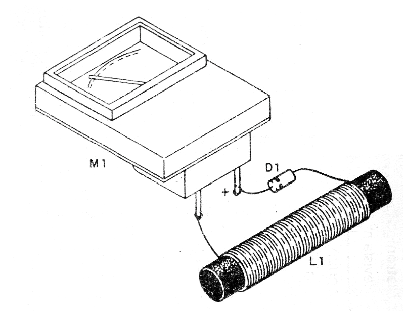 La bobina consta de unas 30 a 50 espiras de hilo fino en un bastón de ferrita y el instrumento es un microamperímetro de 50 uA a 200 uA de fondo de escala.