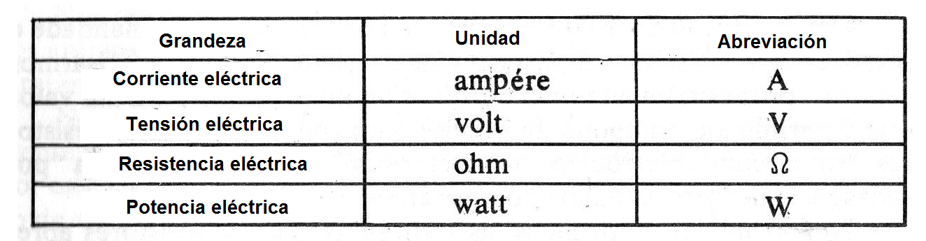 Otras unidades se verán asociadas a la determinación de los componentes, en el momento en que éstos se estudien. Por ahora daremos un pequeño cuadro en el que se reunirán las 4 unidades estudiadas.