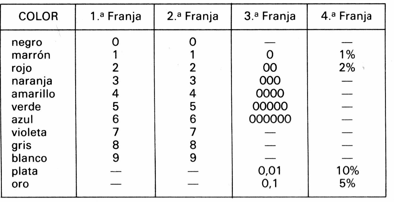 El código de color para leer los valores de las resistencias es entonces el siguiente: