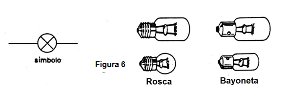 En la figura 6 mostramos algunas de estas lámparas con su símbolo. Vea que estas pueden presentar dos tipos de base y segunda ellas será su encaje en el aparato. Las bases pueden ser de "rosca" y "bayoneta".