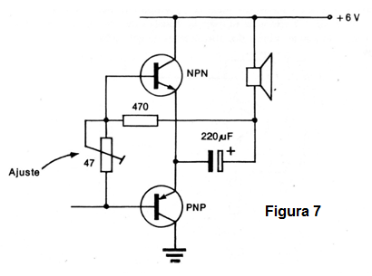 En la figura 8 tenemos otro resistor que polariza el transistor excitador y que puede tener su valor alterado sensiblemente para obtener el menor consumo de corriente sin distorsión.