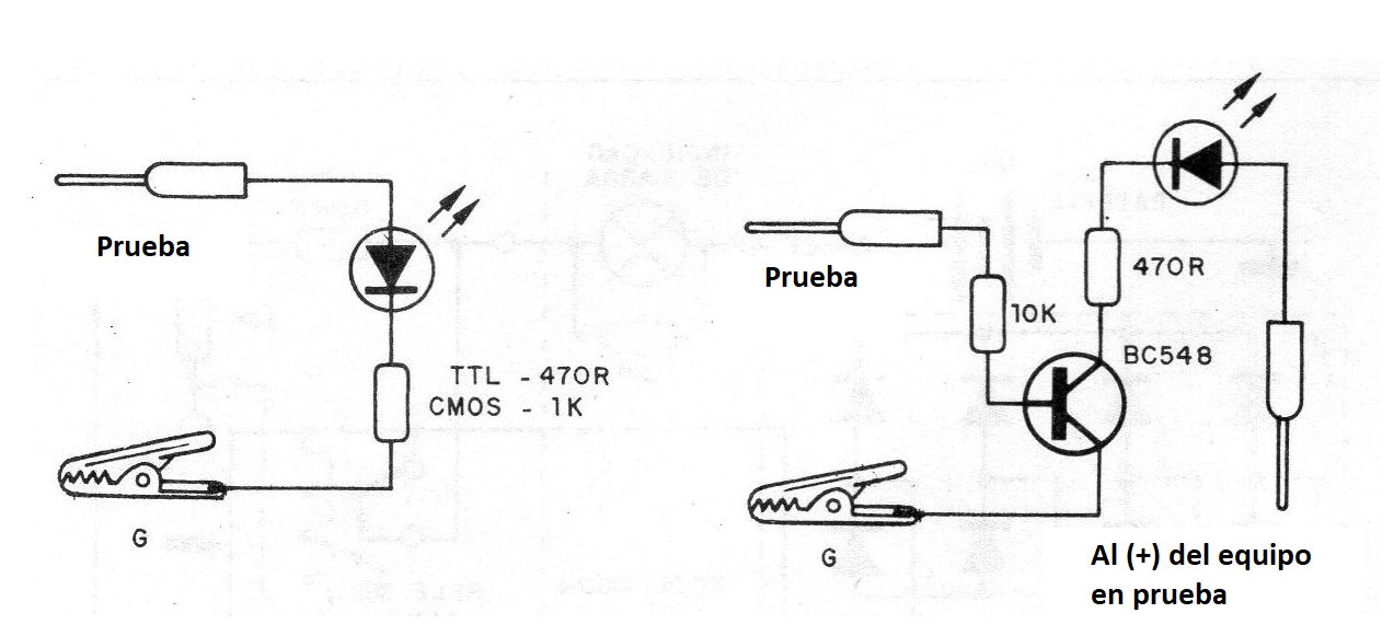 En la falta de un multímetro podemos tener un indicador de nivel lógico "casero" hecho con un LED, o aún un LED y un paso amplificador transistorizado como muestra la figura 2.