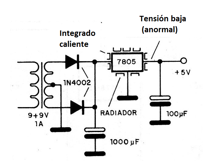 Al comprobar el calentamiento del integrado es interesante tener en cuenta el consumo total del aparato. Para muchos TTL en una misma placa es normal un calentamiento del integrado de la fuente.