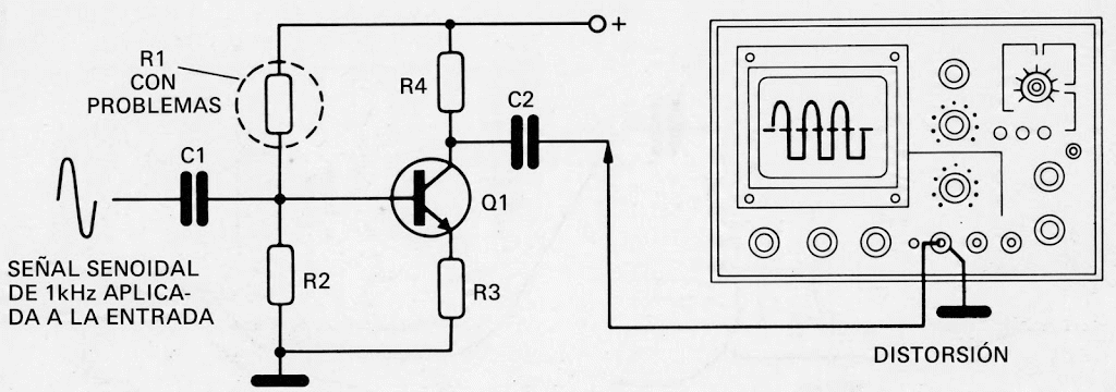 Si se produce un cambio de valor, con mayor resistencia y con cierta polarización, el resultado será una fuerte distorsión en el sonido del amplificador, que se puede verificar con la ayuda del osciloscopio, como se muestra en la figura 6.
