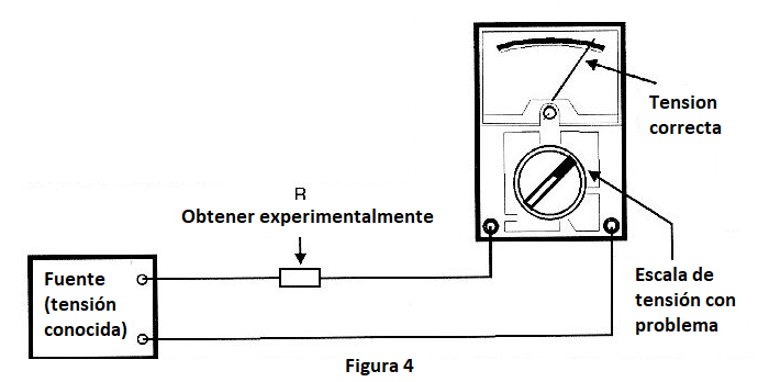 Para el caso de los resistores de las escalas de tensión tenemos un procedimiento similar que tiene como base el circuito mostrado en la figura 4.